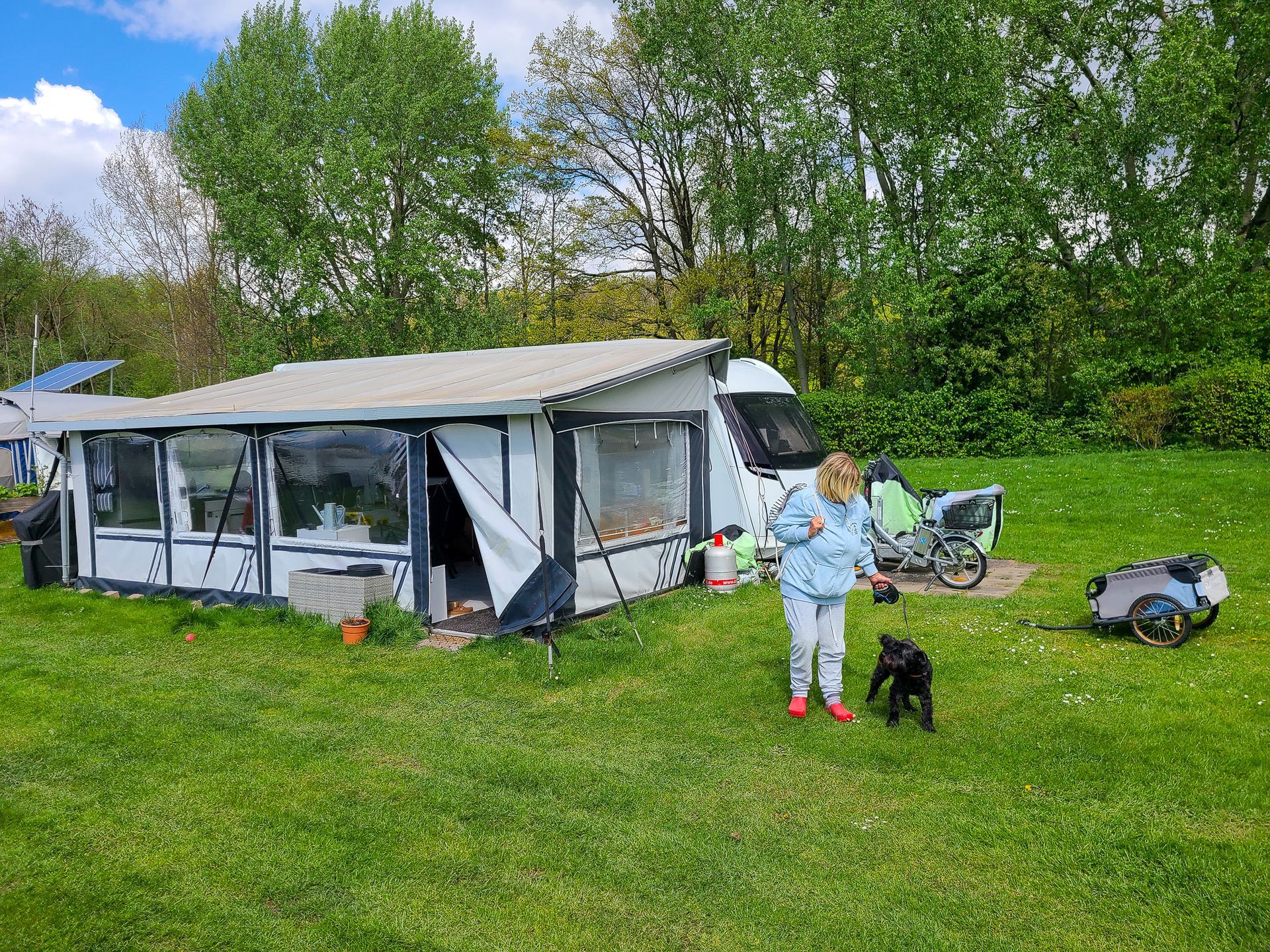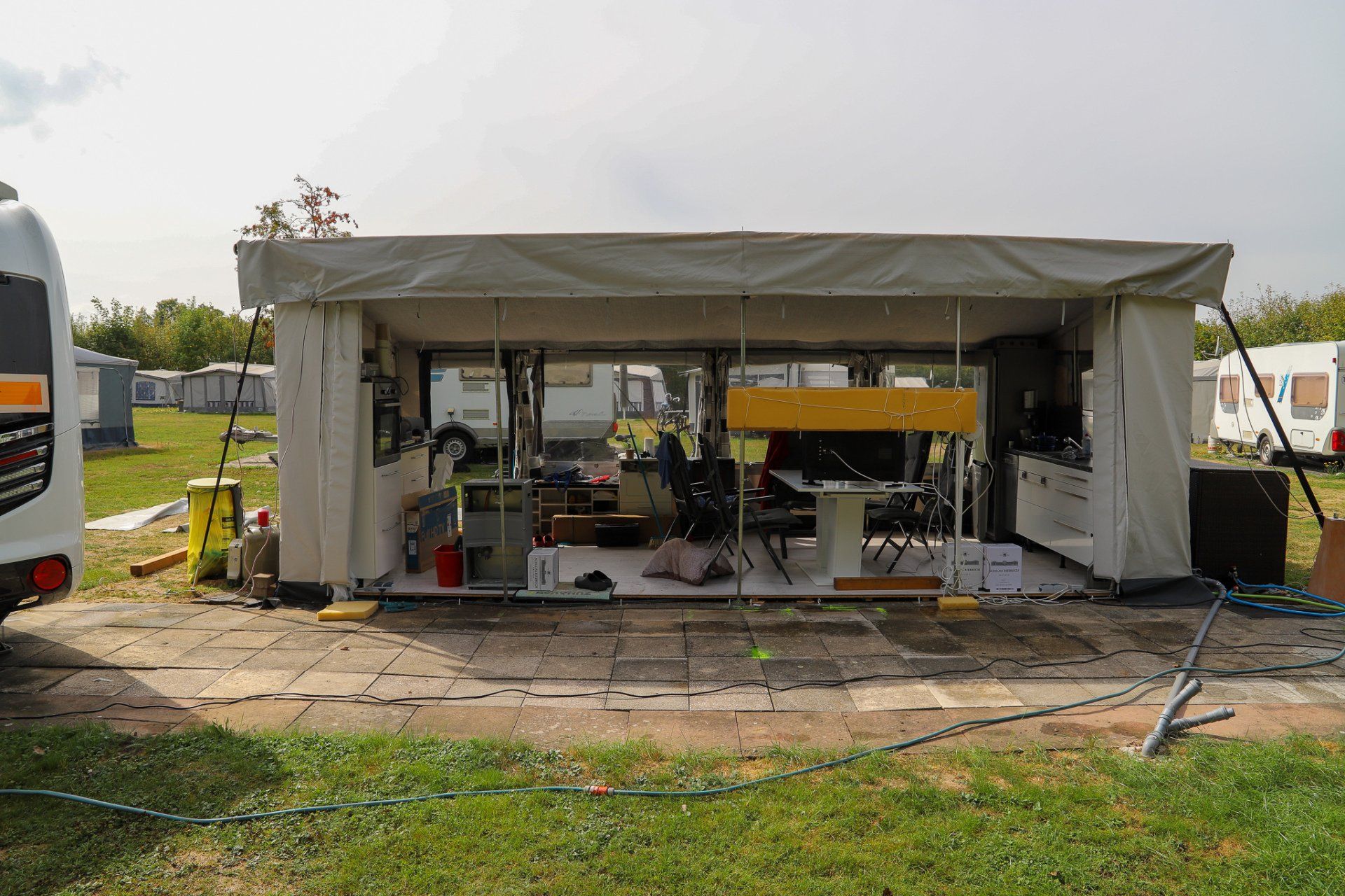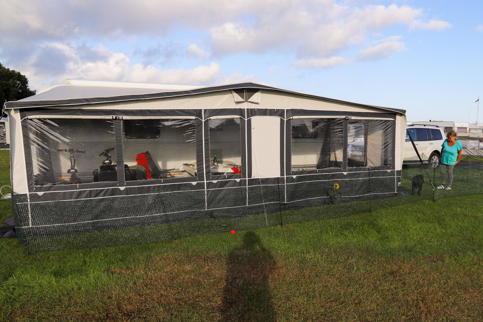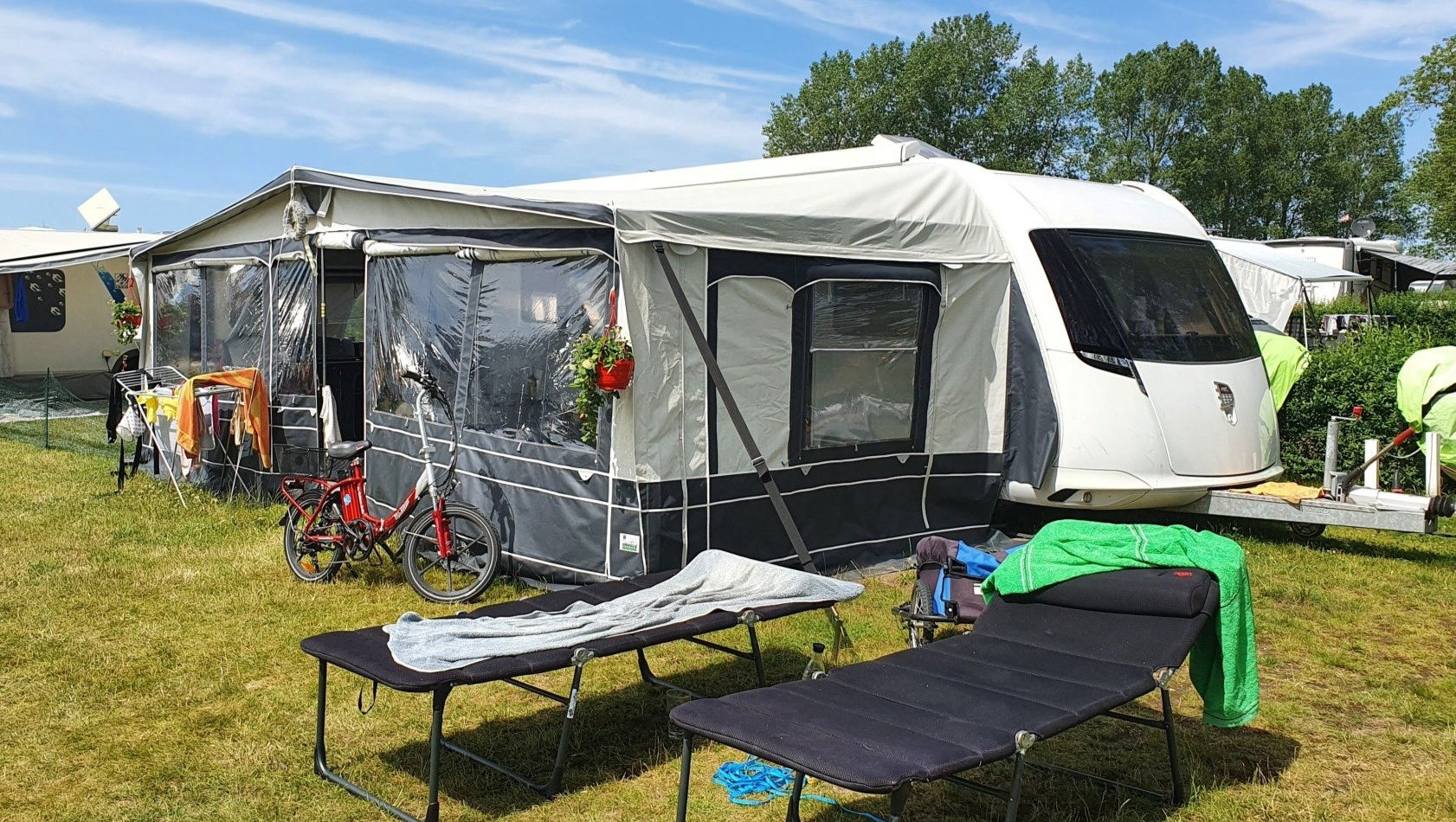 Wir sind hier aber sehr gut angekommen und konnten in der ersten Woche bei bestem Wetter und schweißtreibenden Temperaturen unser Domicil aufbauen und das neue Vorzelt einrichten. Speziell damit sind wir sehr zufrieden. Es ließ sich gut und rasch aufbauen und ist durch das Dach auch sehr schön hell und freundlich. Heute herrscht zum ersten Mal "Schietwetter" mit Regen und Starkwind und auch dabei zeigt es gute Qualitäten.