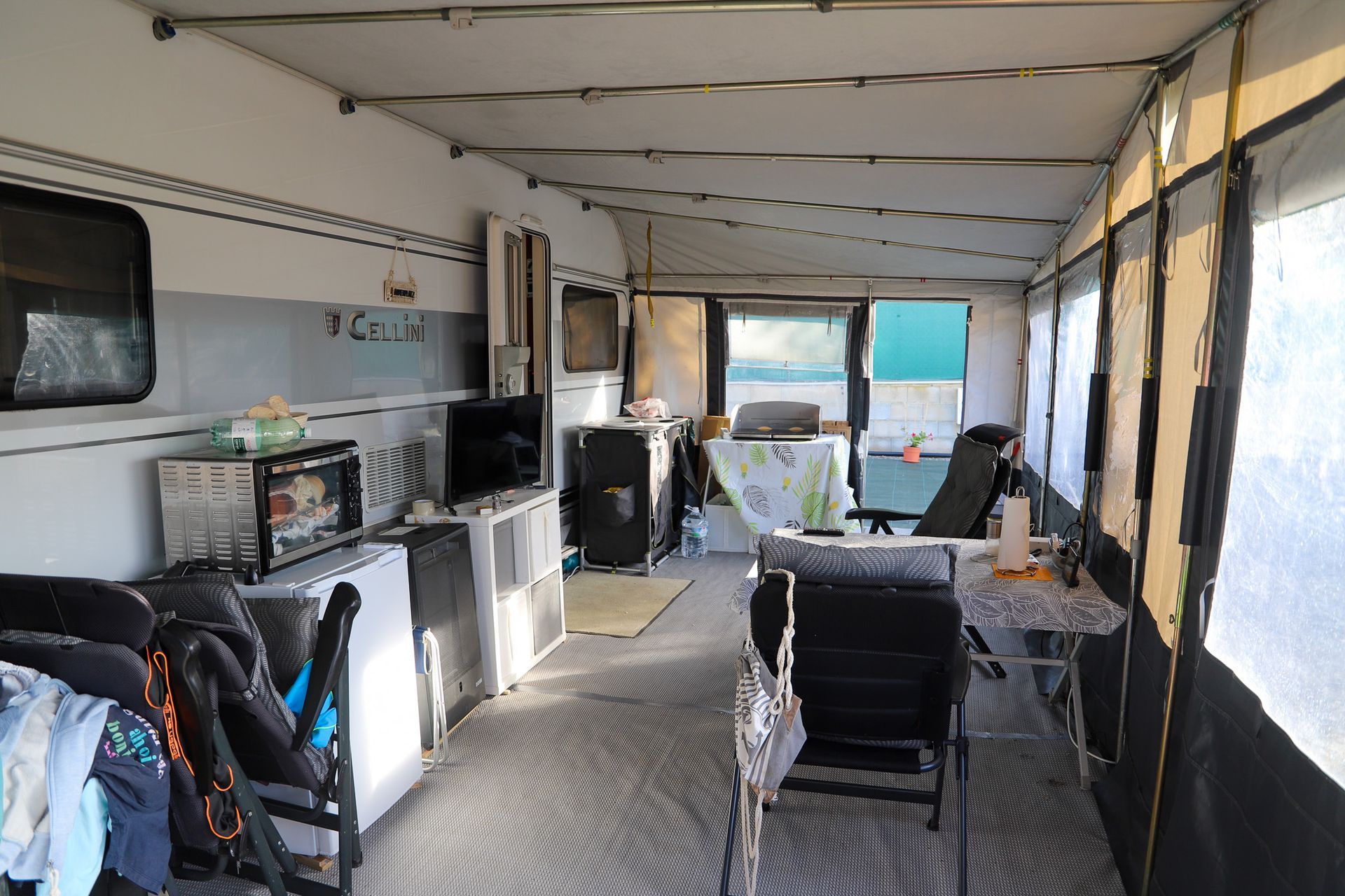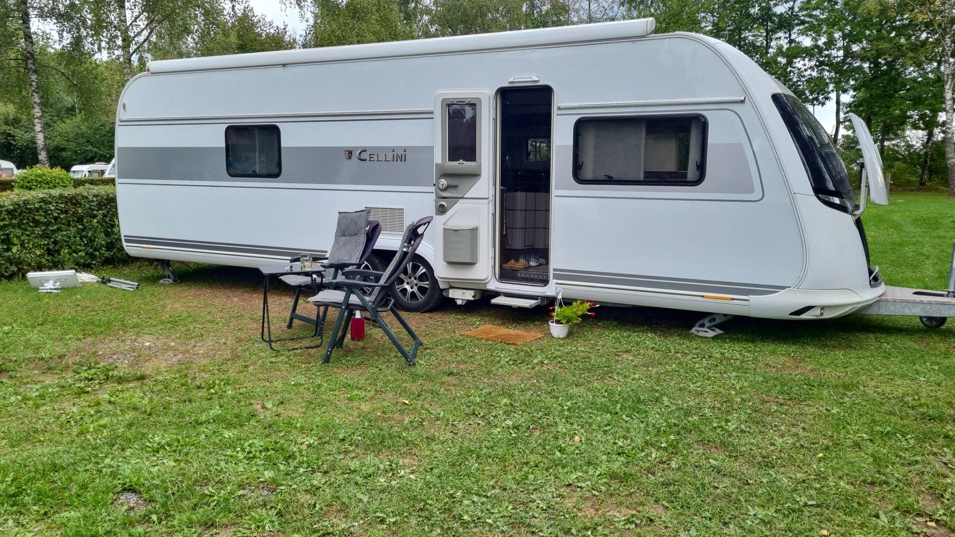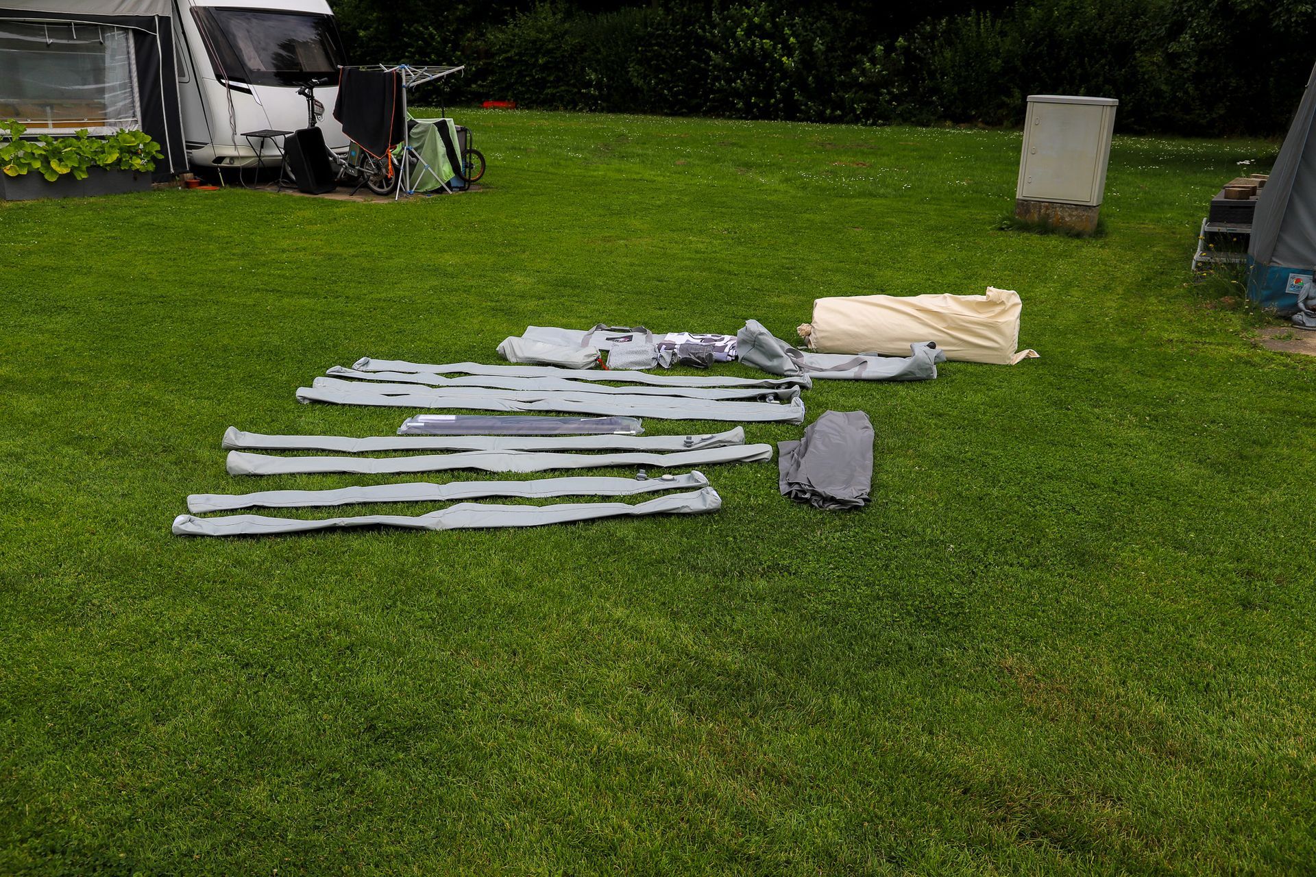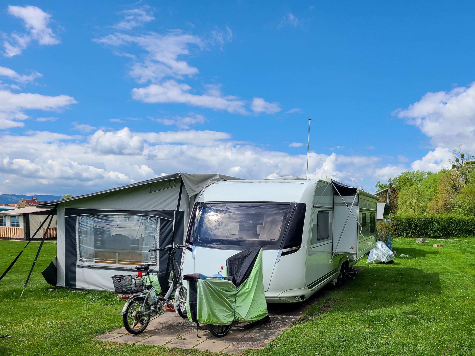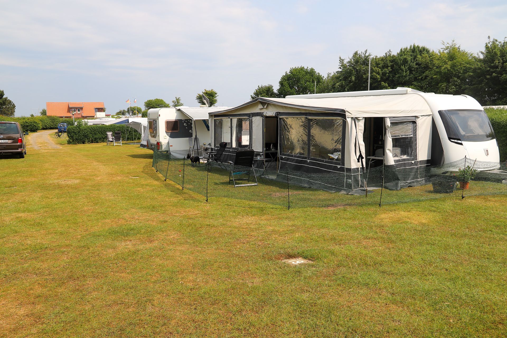 Wir sind hier aber sehr gut angekommen und konnten in der ersten Woche bei bestem Wetter und schweißtreibenden Temperaturen unser Domicil aufbauen und das neue Vorzelt einrichten. Speziell damit sind wir sehr zufrieden. Es ließ sich gut und rasch aufbauen und ist durch das Dach auch sehr schön hell und freundlich. Heute herrscht zum ersten Mal "Schietwetter" mit Regen und Starkwind und auch dabei zeigt es gute Qualitäten.