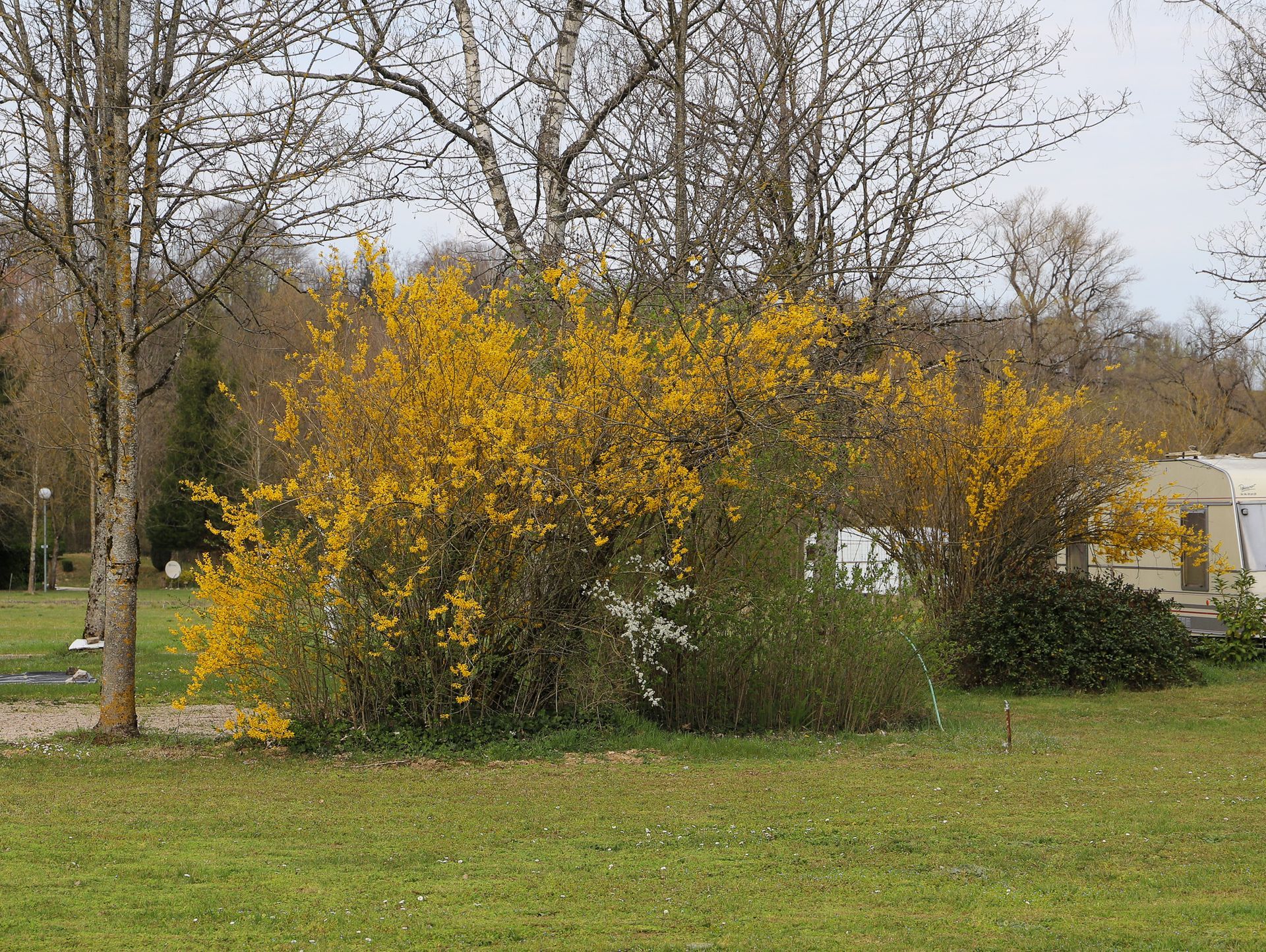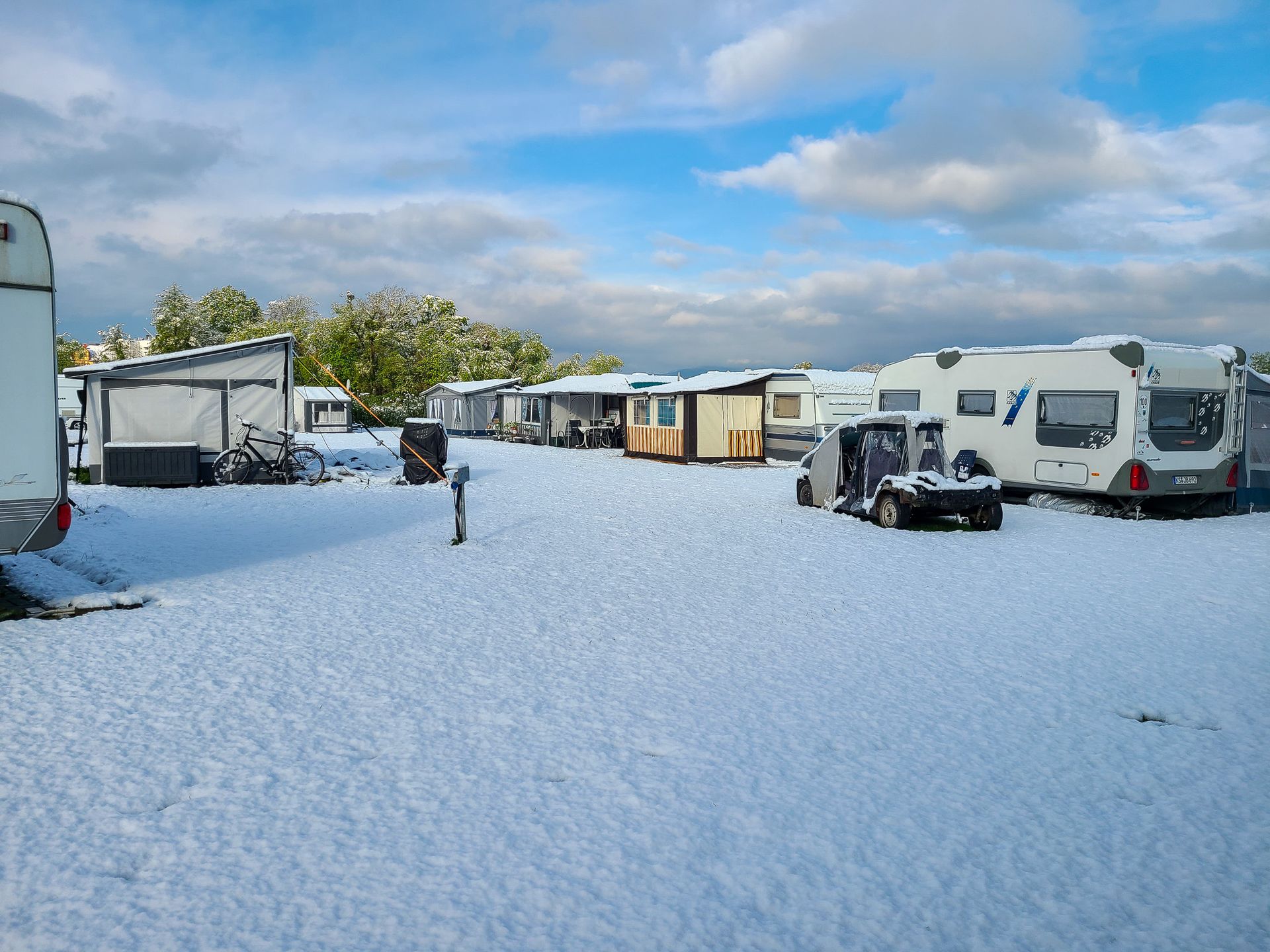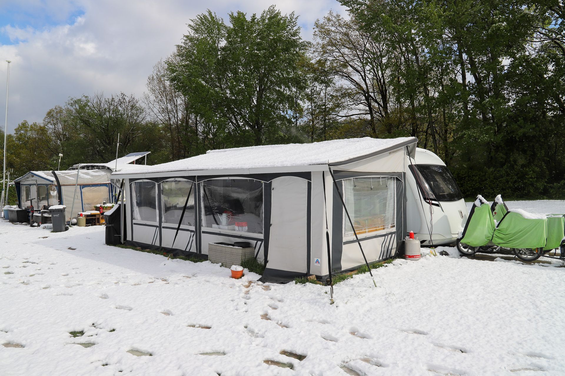 Morgens wache ich auf und schaue aus dem Bugfenster des Wohnwagens und sehe nur weiß. In den frühen Morgenstunden hatte sich der gesamte Campingplatz in eine Schneelandschaft verwandelt. Zahlreiche Äste von Büschen und Bäumen sind, wegen der schon kräftig vorhandenen Belaubung, unter der Last zusammen gebrochen. Die Temperaturen liegen nur wenig über Null.