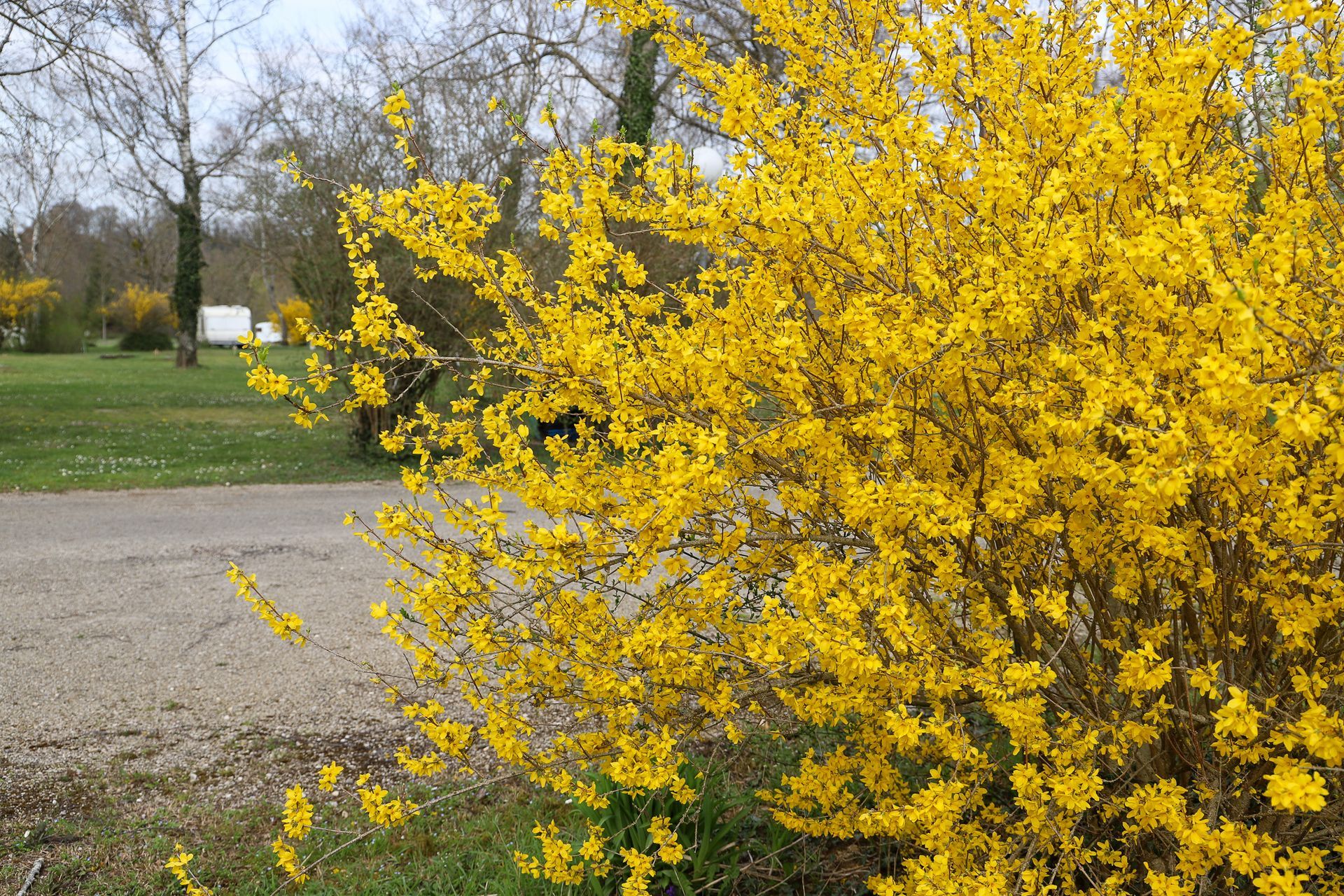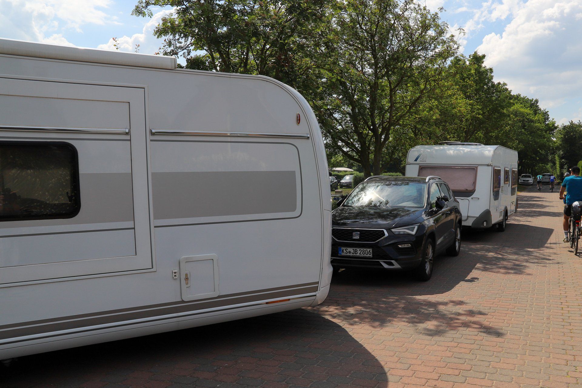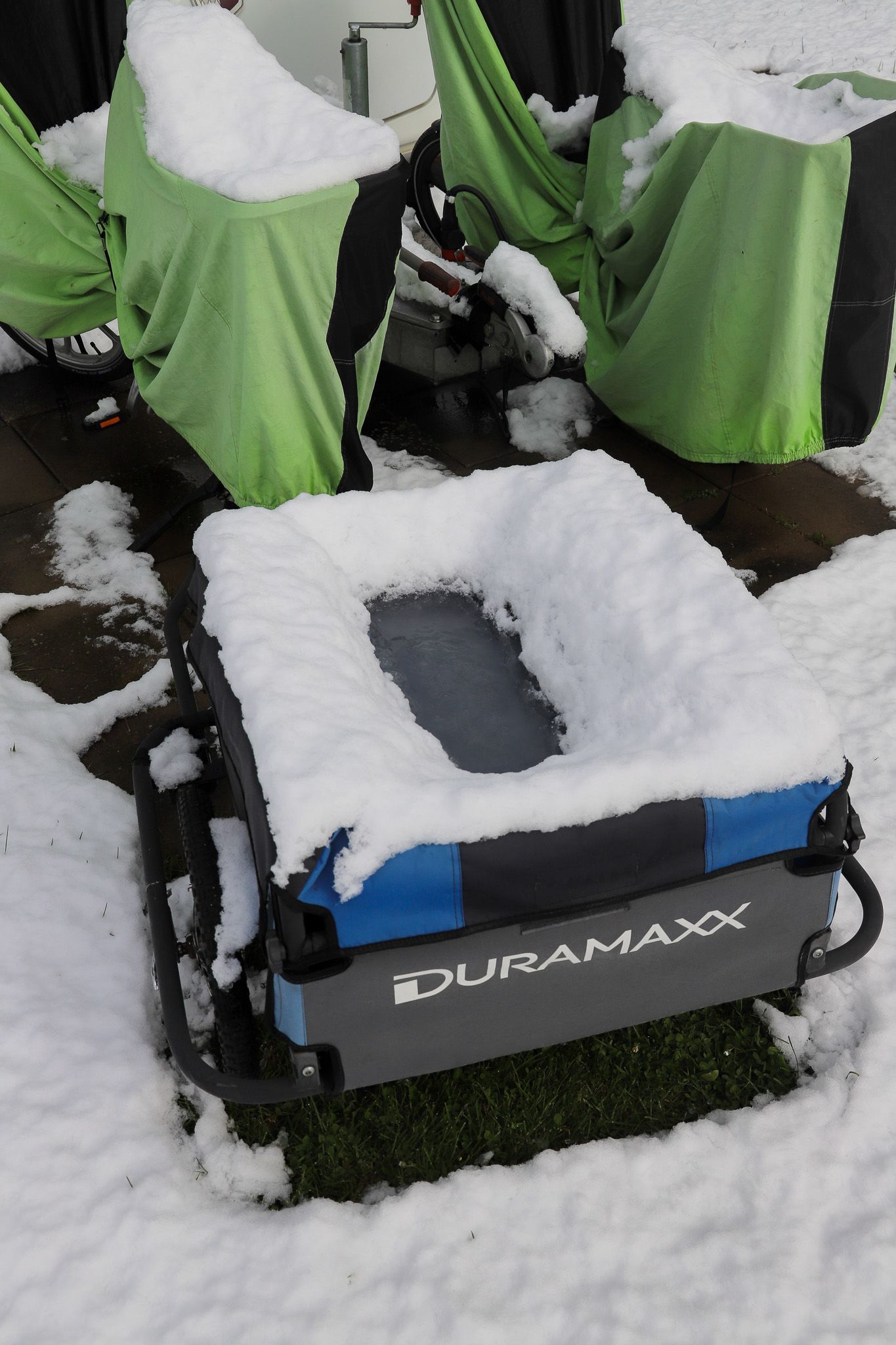 Morgens wache ich auf und schaue aus dem Bugfenster des Wohnwagens und sehe nur weiß. In den frühen Morgenstunden hatte sich der gesamte Campingplatz in eine Schneelandschaft verwandelt. Zahlreiche Äste von Büschen und Bäumen sind, wegen der schon kräftig vorhandenen Belaubung, unter der Last zusammen gebrochen. Die Temperaturen liegen nur wenig über Null.