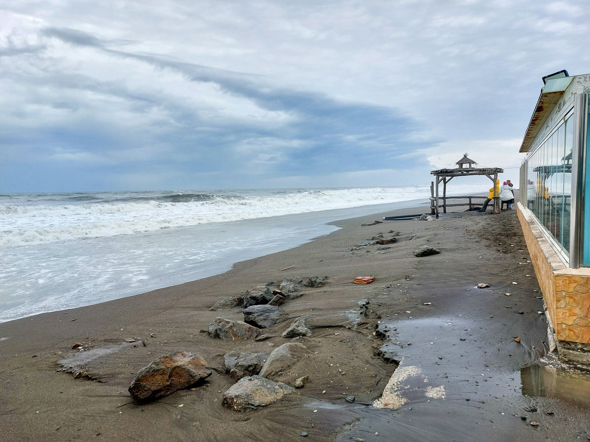 Viel Regen und Wind bestimmen das Wetter der letzten Tage. Die letzten 24 Stunden waren der Höhepunkt. Durch den Wind hat sich eine enorme Dünung aufgebaut und große Teile des ohnehin schon schmalen Strandes weggespült. Auch das Fundament der Strandbar ist gefährdet.