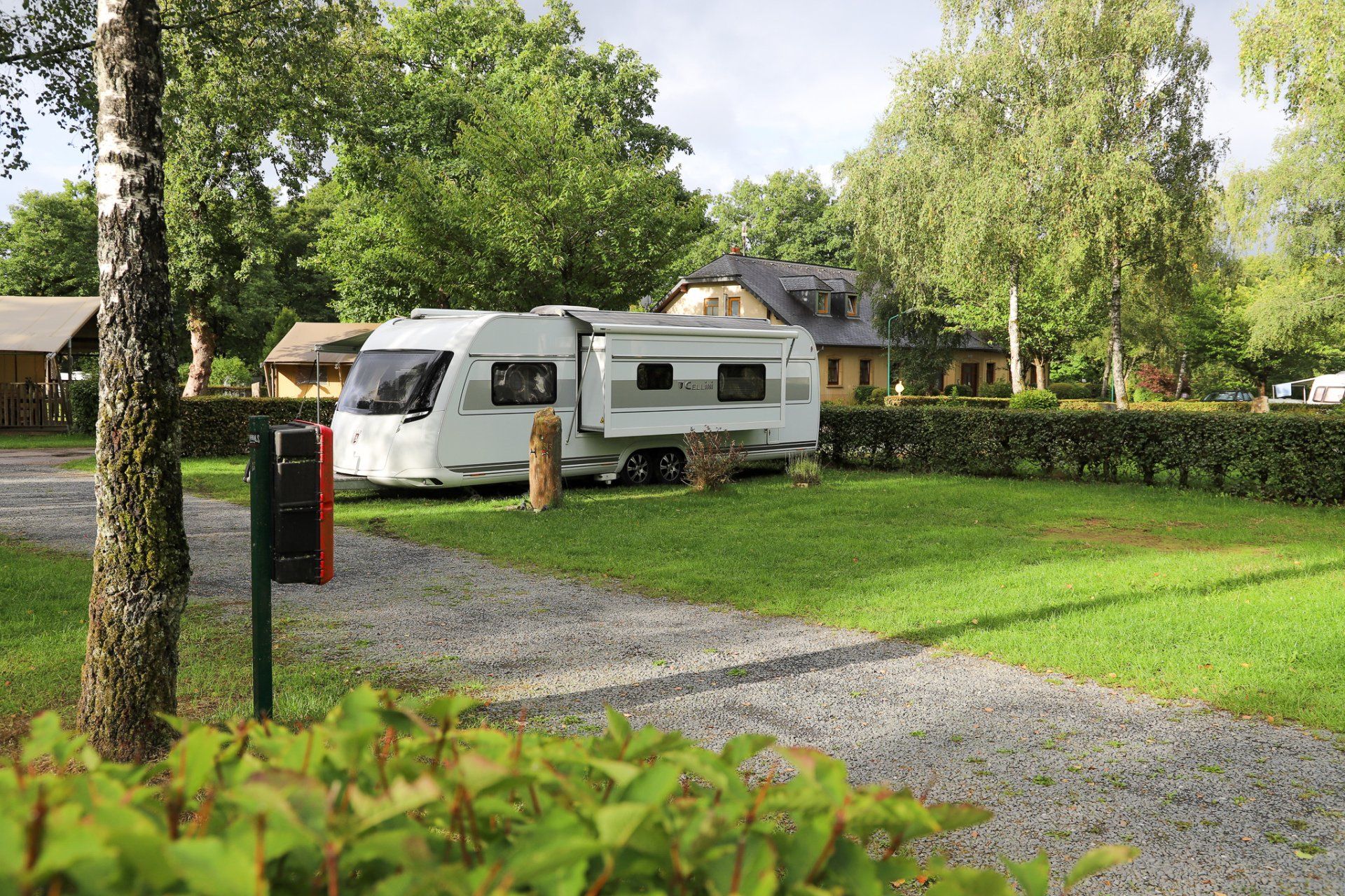 Der Campingplatz in der Nähe war klein sehr gepflegt und mit ausreichenden Platz für größere Wohnwägen. Besonders sind hier neben den Fischteichen die frei laufenden Hühner.