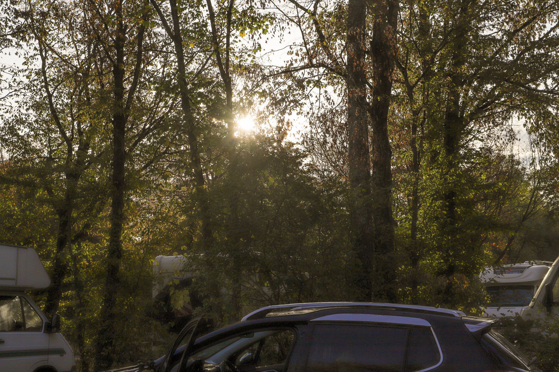 Am Morgen fiel erst nur die etwas eigenwillige Verfärbung des Vorzeltteppiches auf. Bei näherer Betrachtung sah man dann den sehr feinen Staub in rötlich brauner Farbe aus der Sahara mit dem Tiefdruckgebiet "Elke" importiert. So fein wie Mehl und auch ansonsten von ähnlichen Eigenschaften. Mit ein wenig Wasser vermischt, ergab es eine zähe Paste, die sich schlecht entfernen ließ. Für dieses Wasser sorgte der Regen. Gnädiger Weise fiel er anschließend in größeren Mengen von ca. 100 l pro Quadratmeter vom Himmel. Damit wurde der größte Teil des Spukes abgewaschen. Auch der Staub in der Luft, wie auf dem Bild, wurde größten Teils herausgewaschen, ein Wetterphänomen, dass wir nur zu gut aus Gran Canaria im Jahr 2020 kannten.