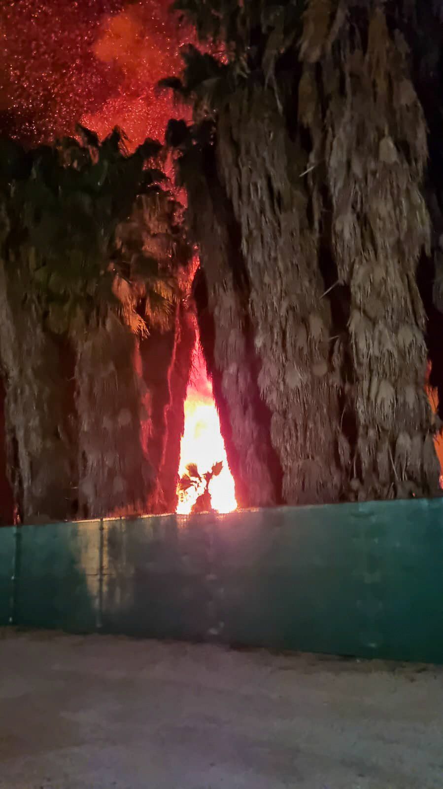 Geschlafen hatten wir noch nicht, als plötzlich unsere Nachbarin die Tür von ihrem Wohnmobil öffnet und "ach du Schei..." ruft. Da sahen wir uns auch genötigt, aufzustehen und nachzuschauen. Zu dem Zeitpunkt war der Nachthimmel gen Westen hell erleuchtet und die Palmen Schonung jenseits der Pferdeställe auf dem Nachbargrundstückt stand in Flammen. Die Flammen schlugen mindestens 20 Meter in die Höhe und ordentlich Funken und glühende Palmwedel stiegen in den Nachthimmel.