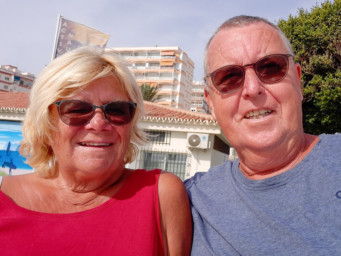 Uns geht es gut, wie man unschwer erkennen kann. Wir wollen uns auf diesem Wege für die Glückwünsche zu unserem 45. Hochzeitstag bedanken. Hier sitzen wir auf der Promenade von Torre del Mar und wollen in Kürze Mittag essen.